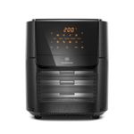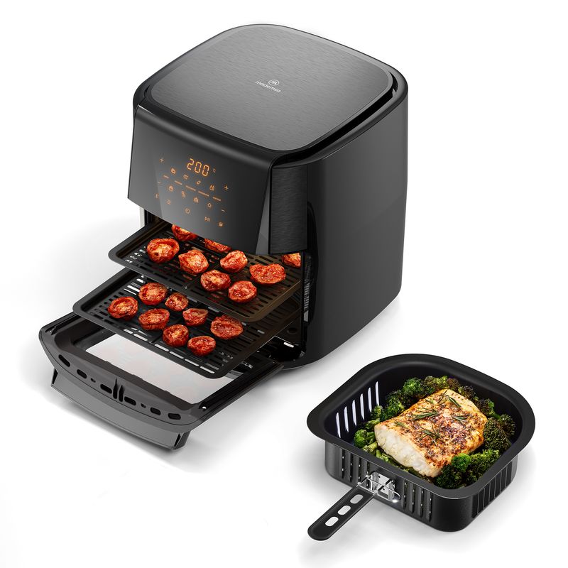 2 rejillas, brocheta giratoria y gancho, bandeja colectora de residuos y canasta interna de 3,5L.
