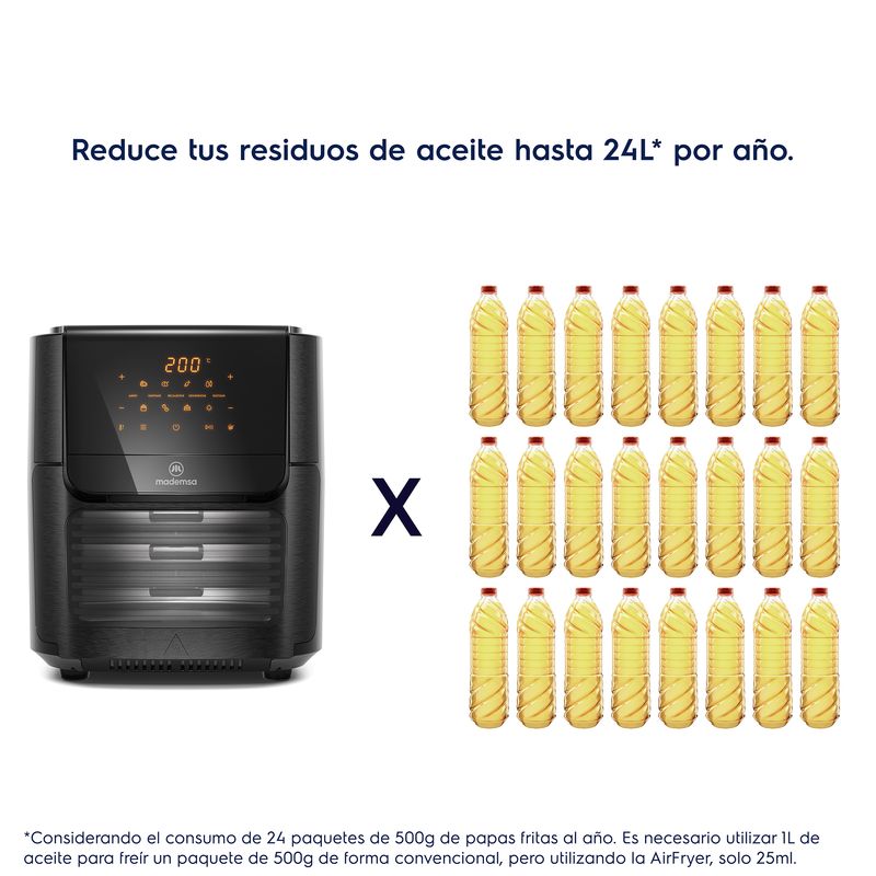 ²Teniendo en cuenta el consumo de 24 litros de 500g de papas fritas por año. Es necesario utilizar 1L de aceite para freír un paquete de 500g de forma convencional, pero utilizando AirFryer, solo 25ml.