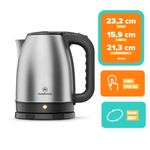 Su jarra de 1,8 litros ofrece amplia capacidad y versatilidad para calentar agua para diferentes preparaciones. Con acabados en acero inoxidable, este hervidor rápido agrega belleza y eficiencia a tu cocina, siendo fácil de limpiar y de usar.